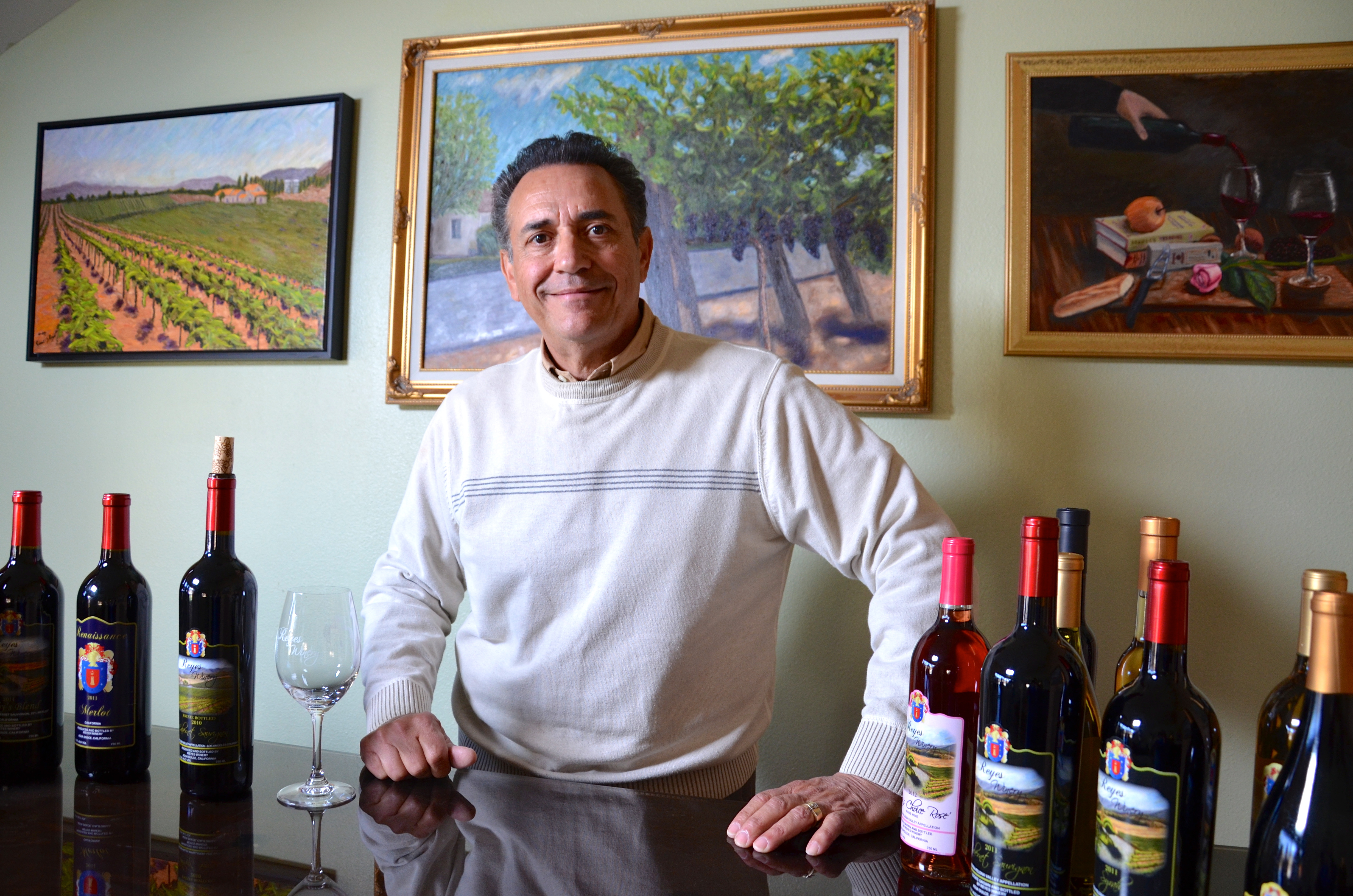 On display in the tasting room are Reyes’ own paintings of the vineyard and scenes evocative of his homeland. Also visible are some of the awards his wines have garnered.
